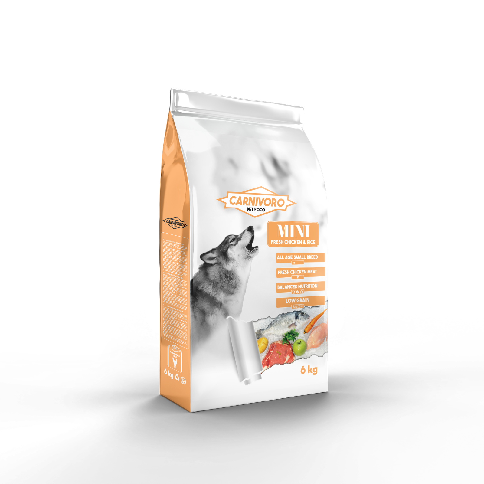 El Pienso Mini de Pollo Carnívoro para perros de razas pequeñas está especialmente formulado para cubrir las necesidades nutricionales de los perros mini, combinando ingredientes naturales de alta calidad, una croqueta adaptada y un perfil nutricional equilibrado.
