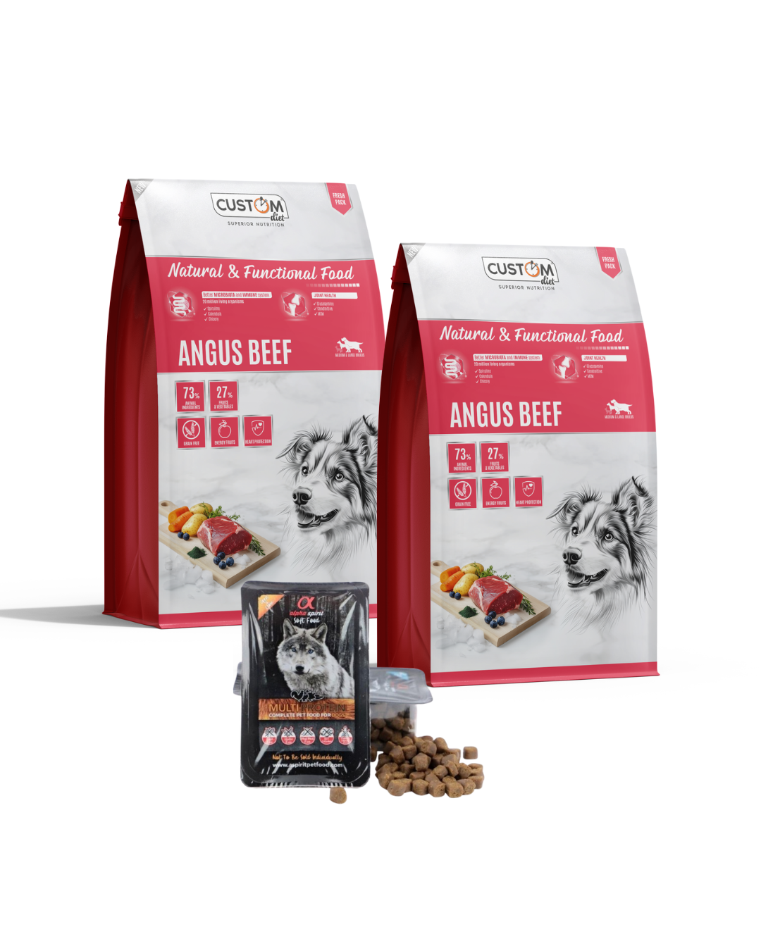 El pienso Custom Diet Angus Beef combina ternera Angus deshidratada y pollo fresco para ofrecer una alimentación natural, sabrosa y equilibrada.