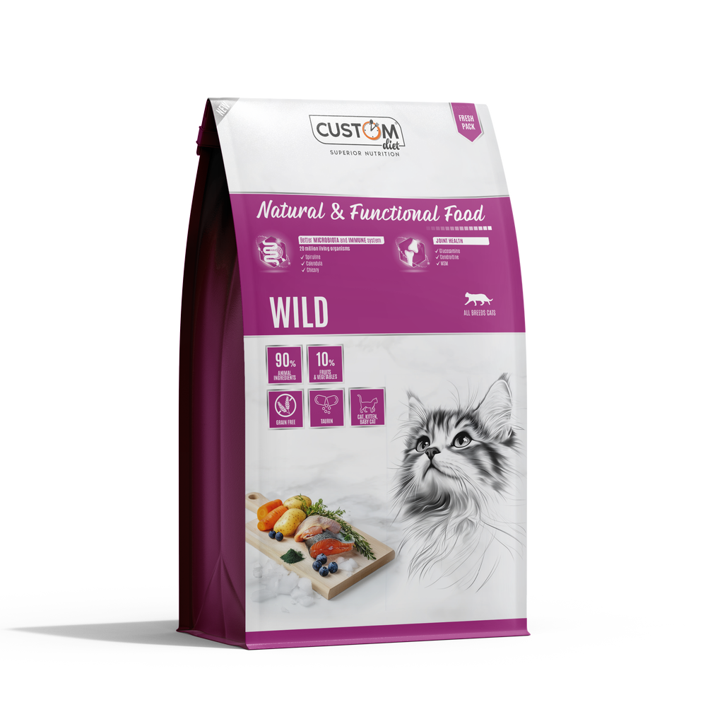 El pienso natural Custom Wild Cat para gatos adultos está elaborado con salmón deshidratado y pollo fresco. Sin cereales, rico en proteínas, Omega 3 y 6, prebióticos y probióticos para una digestión óptima, piel sana y pelaje brillante. Calidad premium disponible en Ecomascota.biz.