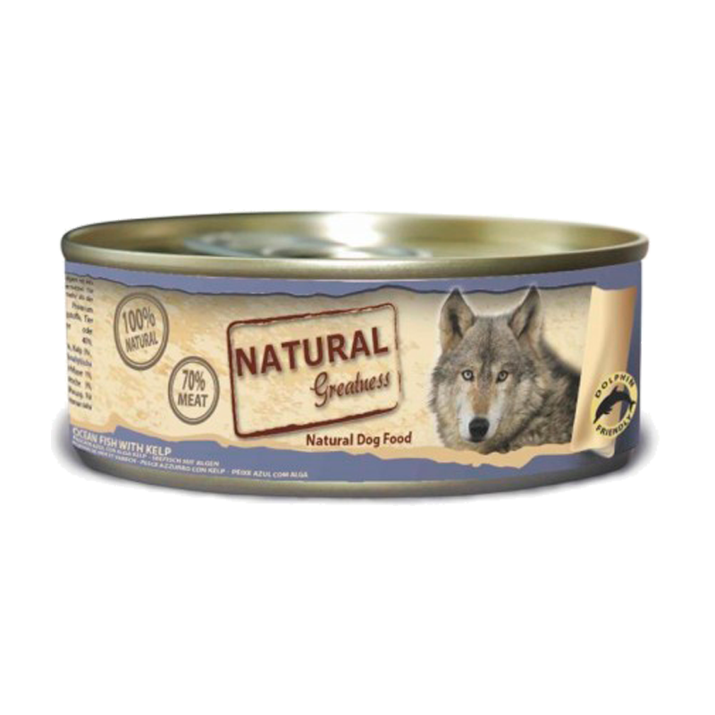 Natural Greatness Pescado de Mar con Alga Kelp es un alimento húmedo complementario y 100 % natural, formulado para perros y gatos de todas las razas. Su receta combina pescado azul (caballa y atún) con alga Kelp, un superalimento rico en minerales y antioxidantes que favorece la salud digestiva, la piel y el pelaje.