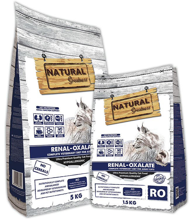 Pienso natural formulado por veterinarios para gatos con insuficiencia renal crónica. Natural Greatness Renal Oxalate ayuda a preservar la función renal y prevenir cálculos de oxalato. Bajo en calcio y vitamina D. Sin cereales.