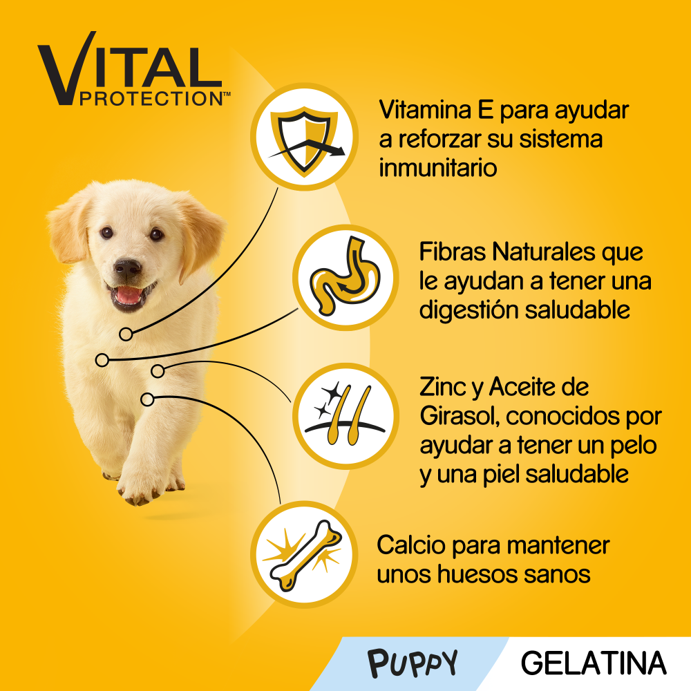 Pedigree Junior combina pollo y buey con arroz, una fuente de energía fácil de digerir, ideal para estómagos en desarrollo.